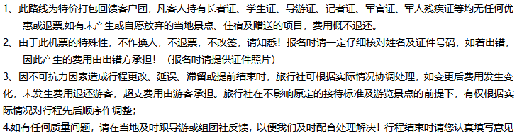 特殊說明:行程景點門票均為旅行社統一采購價,且經旅游局批準已進行旅游團隊系統的優惠,故對所有證件(學生證、教師證、軍官證、老年證、殘疾證等證件)均不在享受任何優惠政策,其優惠價格不予退還。贈送項目及景點如因個人原因或不可抗力因素或天氣原因無法參觀游覽,門票費用不退,不置換,敬請諒解!